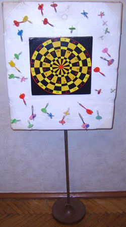 Метание и попадание по маленьким надувным шарикам оценивается призами. В игре с мишенью обозначенной 1-5 балов за точность метания, при попадании в "молоко", то есть за целью мишени, и вообще мимо мишени снимается по 1, 2 бала.