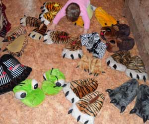 Два - три десятка пар мягкой обуви лап животных, предлагается поиграть детям в игровом общительном, игровом аттракционе, выставленном как на частном праздновании дня рождения, так и на развлекательных, массовых акциях, посетителей ТРЦ, фестивалей и др.