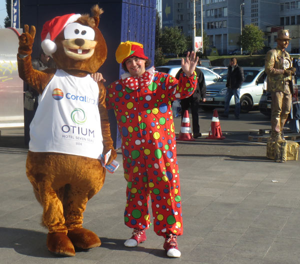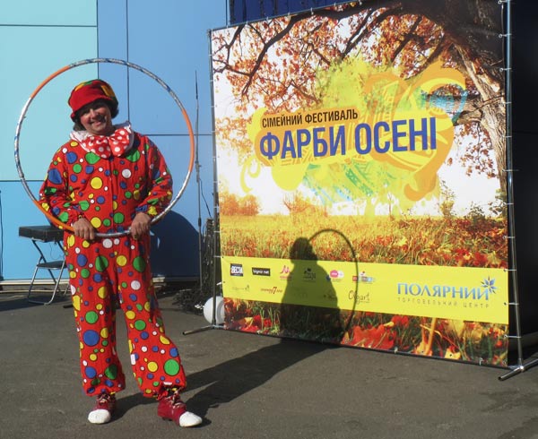 Клоун на моноцикле и перед входом в ТЦ, и в помещении ТЦ