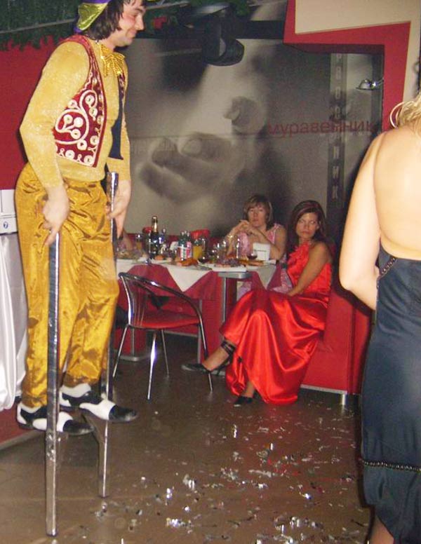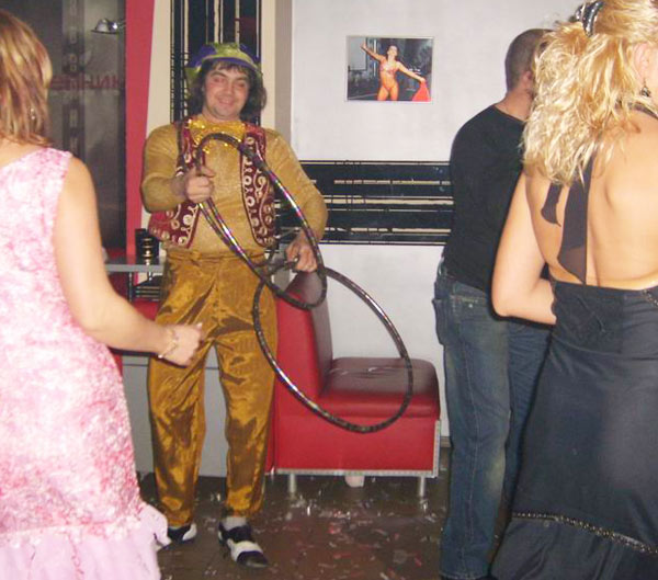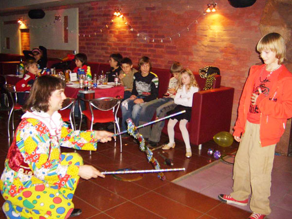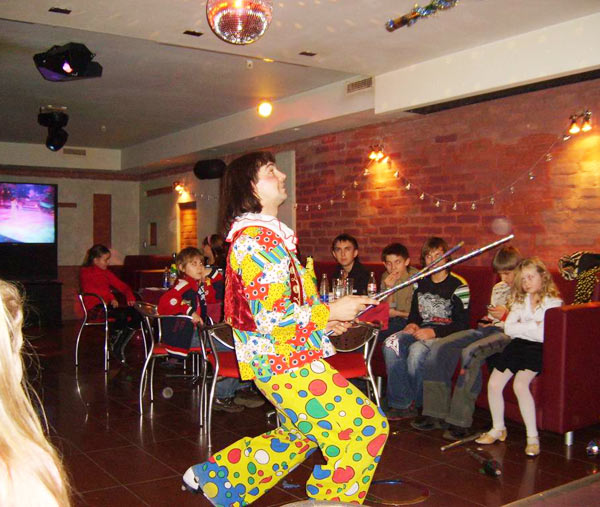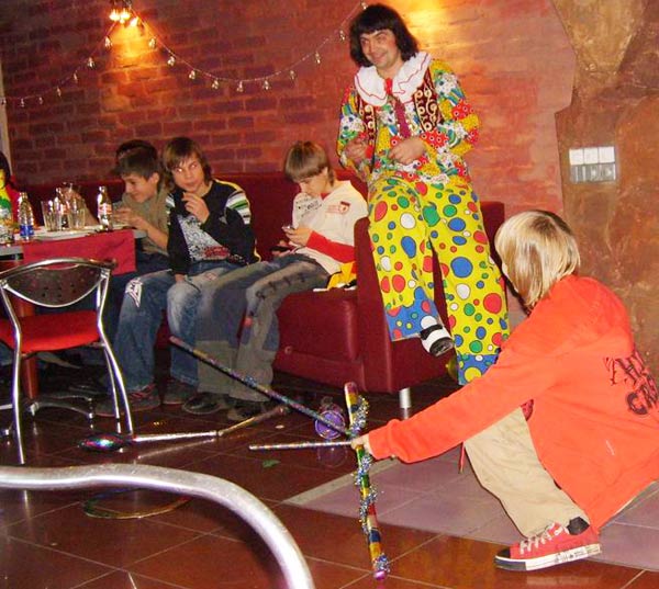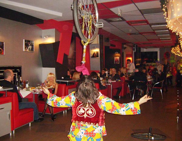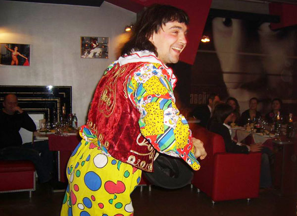 Клоун успевает не только менять свои концертные костюмы и выступать, но и развлекать гостей ресторана, как в двух залах второго этажа, так и на первом этаже, где новый год празднуют дети.