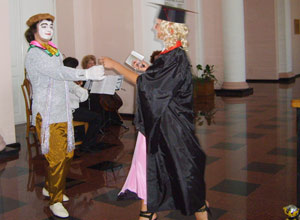 Развлечение клоуна посетителей выставки картин жонглированием, хождением на ходулях, играми с детьми, - улыбка и настроение, вот цель, успех и задача клоуна.