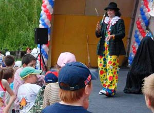 Клоун развлекает на открытии зоопарка "12месяцев"